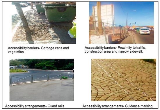 One of the researchers accompanied ten individuals with VI from different neighborhoods on their routine walking routes, from their home to destinations such as the closest public transportation station, food store or workplace. Using the Collector for ArcGIS© application, we configured the fields for data collection requirements, documented and mapped the route, and further documented relevant entities, such as obstacles (We usually used the term ‘obstacle’ for physical obstacles reported by participants. The term ‘barrier’ was related to a more general category of ‘accessibility barriers’) and specific infrastructure entities for individuals with VI. We then documented geographic location, descriptive data, and photographs of these features. We defined prior to data collection, according to literature review and focus groups (FGs) conclusions, which entities to document systematically. Thus, we documented along the routes all the crosswalks (full accessibility was assessed by the presence of both audible signal and tactile paving; partial accessibility with one of these; inaccessibility if both were absent), public transportation stations (accessibility was assessed by the presence of audible signals), stairs (accessibility was assessed by the presence of visual/tactile warning strips, and we also documented the presence of ramps), narrow and unsmooth sidewalks and proximity to construction sites. We also documented the presence of guard rails, guidance marking (tactile paving/paths) and public fitness facilities. The physical sidewalk obstacles reported by participants in real-time were grouped into one category and denoted as “obstacles-other”. This included documentation of problematic locations of electric polls, lampposts, garbage cans, vegetation, mail boxes, street or store furniture as well as inexistent sidewalks, proximity to traffic, poor lighting or dangerous descents. The nature of accessibility of each documented entity was assessed according to predefined coding rules agreed upon by all researchers (presence of audible signals, tactile paving or visual warning strips) and participants’ reports (defined as the “Obstacles-other” category). We performed a separate analysis of the accessibility of crosswalks, public transportation stations and stairs. We then divided the different entities into “accessibility barriers” and “accessibility arrangements”. The elements related to physical obstacles or inaccessibility issues were denoted as “accessibility barriers” and included the categories of “Obstacles-other”, inaccessible crosswalks/public transportation stations/stairs, unsmooth and narrow sidewalks and disturbing construction sites (due to lack of safety fence or safe walking spaces). Elements defined as accessible or as promoters of active lifestyle for individuals with visual impairment were designated as “accessibility arrangements” and included accessible crosswalks (with full and partial accessibility), accessible public transportation stations, accessible stairs, as well as “other accessibility arrangements”, which included guardrails, guidance marking, and public fitness facilities along the routes (Supplemental Table S1. Description of the documented Entities).