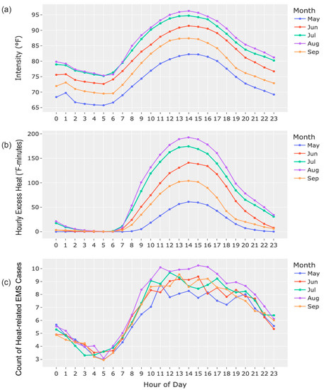 Thus, this study advances the inquiry into the temporal patterns of heat indices in the summertime and the hourly lagged effect of heat indices on heat-related health illnesses. This paper aims to address the gap in the literature by investigating the following research questions: (1) what are the hourly patterns of the heat index and heat-related EMS incidents during summertime? and (2) how do the lagged effects of heat intensity and hourly excess heat vary by heat-related symptoms?