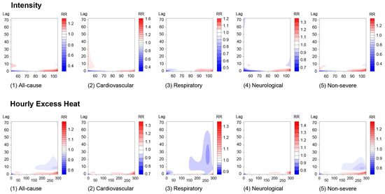 For all-cause heat-related symptoms, low intensity (5th percentile = 65 °F, 18.33 °C) has protective effects during lag 0–48 h (RR was 0.82 (95% CI: 0.73, 0.94)). In addition, all-cause, cardiovascular, respiratory, and non-severe cases show a higher RR during the lag 0–10 h (RR: 1.34 (95% CI: 1.24, 1.45), 1.24 (95% CI: 1.07, 1.43), 1.24 (95% CI: 1.03, 1.50), and 1.50 (95% CI: 1.33, 1.68), respectively), while neurological cases show more immediate detrimental impacts within 5 h (RR: 1.47, 95% CI: 1.28, 1.69). In all cases and subgroups, the highest RR for high heat intensity is shown at the lag 0–5 h.