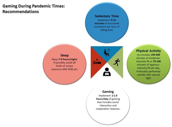 Additionally, evidence suggests that prolonged exposure to video games, especially before bedtime, may have negative effects on various sleep outcomes, such as sleep duration, sleep onset latency, and sleep efficiency []. To reap the benefits of video gaming while maintaining healthy sleep patterns during lockdowns, it may be advisable to limit or completely avoid screen exposure before going to sleep.
