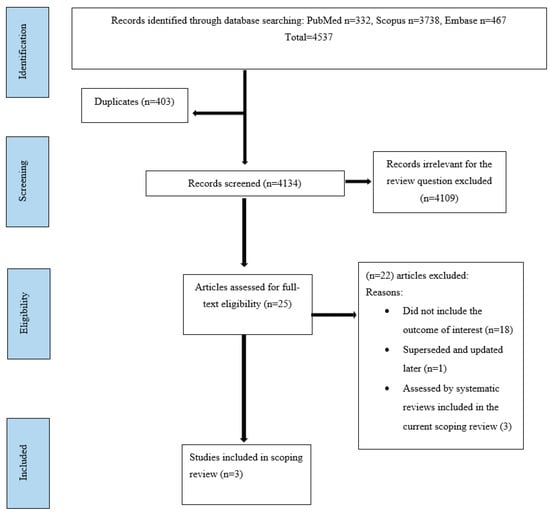 A total of 4537 articles was yielded through the search strategy. The number of articles left for screening after removing duplicates was 4134. Having reviewed the titles and abstracts as per the inclusion and exclusion criteria, the reviewers decided to include 25 articles for full-text review after excluding 4109 articles, which were not in line with the review question. Subsequently, the reviewers carefully assessed these articles for their relevance and, after a lengthy discussion among all three reviewers, a consensus was reached to include three articles for full review. Figure 1 sums up the Preferred Reporting Items for Systematic reviews and Meta-analysis (PRISMA) [] flowchart of the scoping review process alongside the number of articles excluded and the reasons for their exclusion.