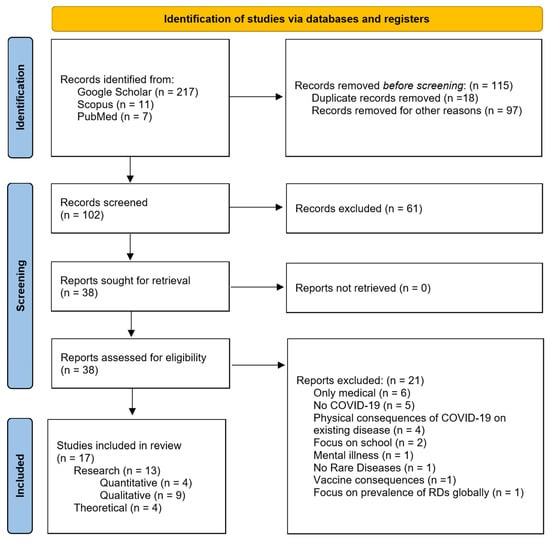 The screening process involved the first and second authors independently reading the abstracts and texts of the first 102 (47% of the total) articles. After the first screening, the two authors discussed the inclusion criteria, and, considering the focus of this review, they decided to exclude articles that focused only on the medical aspects of the relationship between COVID-19 and RDs. They decided to focus on articles written in English across the world, not limited to a particular RD, and to consider equally salient the points of view of RD patients, their relatives/caregivers, medical professionals, and RD associations. In this phase, 61 articles were excluded due to inconsistencies with the objectives of this paper.
