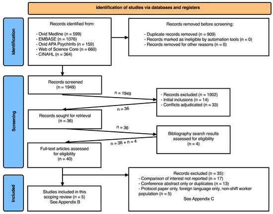 Our search strategy yielded 1949 records (titles and abstracts) after deduplication, of which 36 were retained for full-text review (Figure 1). Inter-rater agreement at the screening phase was moderate (Kappa = 0.43) and comparable to the agreement reported in previous reviews [,]. We searched bibliographies of all 36 retained publications and identified an additional four potentially relevant articles. In total, 40 full-text articles were evaluated against our P.I.C.O. criteria. Five articles were retained, describing three observational and two experimental research studies that targeted shift workers and examined non-invasive indicators of endothelial function in relation to the exposure to night shift work. However, none of these five studies addressed the comparison of interest: the effect of napping/sleeping during night shift work (compared to no napping/sleeping) on the non-invasive indicators of endothelial function. We charted the key findings from these five ancillary articles [,,,,], which can be accessed in Appendix B. Below, we describe these studies along with the research gaps. In total, we excluded 35 articles out of the 40 assessed during the full-text review that did not target shift workers or failed to address multiple elements of our P.I.C.O. The reasons given for exclusion appear in Appendix C. All the publications reviewed as part of the bibliography search were excluded.