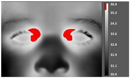 Representative image of the regions of interest (ROI) on the inner canthus of the eyes in the infrared thermal images (authors’ image). The temperature of the inner canthus of the eyes, Tic,eye (located in the superomedial orbit) is represented in red, while the brain thermal tunnel is also shown.