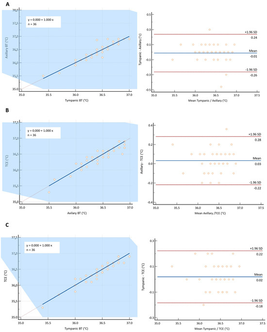 The Passing–Bablok regression scatter plots indicated an agreement of fitted regression line and identity line between the axillary (Tax) and BTT° (Figure 2B) methods and between the tympanic and BTT° (Figure 2C) methods. No proportional difference was observed between the axillary (Tax) and BTT° or tympanic (Tty) and BTT° methods, as evidenced by the results of Table 3. Good concordance between these methods has also been described. The Bland–Altman plots revealed that the bias was close to zero and not statistically significant for the comparison of the BTT° method with the axillary (Tax) (p = 0.136) (Figure 2B) and tympanic (Tty) (p = 0.268) methods (Figure 2C) (Table 4). Furthermore, no proportional bias was evident in the Bland–Altman plots (Table 4) (Figure 2B,C).