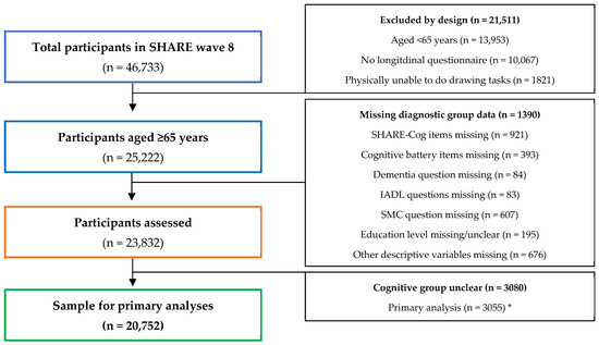 Flow diagram illustrating participant selection and reasons for exclusion from this secondary analysis. * Sensitivity analyses (presented in the Supplementary Material) excluded different numbers due to the cognitive groups being unclear and details on these are provided in Table S2.