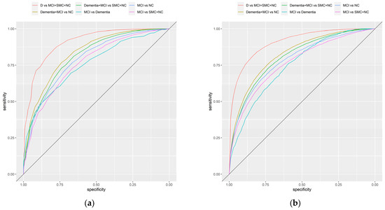 The diagnostic accuracy of SHARE-Cog (Figure 3a) was excellent in its ability to differentiate dementia (from everything else), (AUC = 0.91 and 95% confidence interval (CI): 0.89–0.92) and was very good for separating cognitive impairment (i.e., dementia and MCI) from NC (AUC: 0.83 and 95% CI: 0.82–0.84) and cognitive impairment (dementia and MCI) from SMC and NC (AUC: 0.81 and 95% CI: 0.80–0.82). Similarly, it had good diagnostic accuracy for the other comparisons: MCI versus NC (AUC: 0.79 and 95% CI: 0.77–0.81), MCI versus SMC and NC (AUC: 0.77 and 95% CI: 0.75–0.78) and MCI versus dementia (AUC: 0.76 and 95% CI: 0.72–0.79). Sensitivity analysis was also carried out for different ways of measuring IADLs and excluding the self-reported medical diagnosis question (Table S5). These confirmed similar diagnostic accuracies.