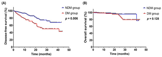 The mean follow-up period for the study participants was 20.26 ± 12.02 months. Differences in DFS and OS according to the presence or absence of depressed mood were analyzed using Kaplan–Meier curve analysis; the results are presented in Figure 1. DFS was reduced in the DM group compared with the NDM group (p = 0.006). The 2-year DFS rate was 93.6% in the NDM group and 86.4% in the DM group. However, the 2-year OS rate was 98.3% in the NDM group and 98.7% in the DM group. There was no statistically significant difference in OS between the two groups (p = 0.128). These data suggested that depressed mood was associated with unfavorable DFS in gynecological cancer patients.