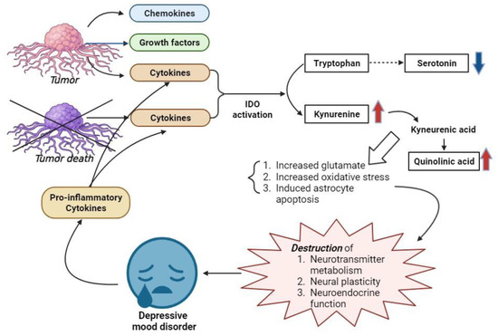 Schematic representation of the mechanism between cancer and depressive mood disorders. Note: IDO, indoleamine 2,3-dioxygenase.