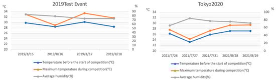 Temperatures at the Odaiba Marine Park during the 2019 test event and the Tokyo 2020 Olympic and Paralympic Games. Numerous athletes presented with heatstroke at the test event, and therefore, the race for the Games was started one hour earlier. Temperature and humidity were both lower at the start of the race at the Games.