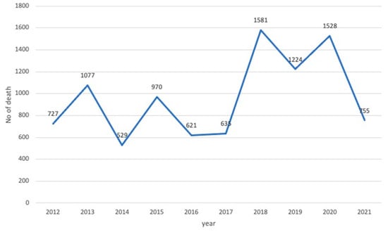 Deaths due to heatstroke in the last 10 years in Japan. In 2020, 1528 people died of heatstroke; only 755 deaths occurred in 2021, the year of the Tokyo 2020 Games.