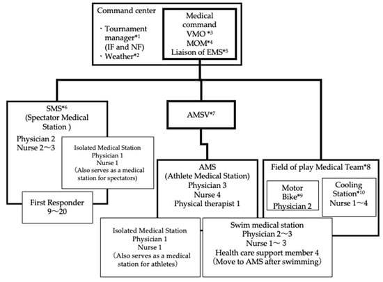 The chain of command of the Tokyo Games triathlon medical staff. Referees and representatives of the IF and NF were stationed inside the command center at the triathlon venue, managing the operations of the entire event. The medical command was composed of the VMO, the MOM, and the fire department EMS liaison. The medical staff was divided into the team for spectators and the team for athletes, and the team for athletes was further divided into the athlete medical station and field of play medical teams. The AMS managed the athlete medical stations with the IF, and the VMO directed the field of play team. *1: Tournament manager: The manager in charge of Tournament of IF and NF. *2: Weather: Person in charge of checking the weather. *3: VMO: Doctor in charge of medical supervision at the venue. *4: MOM: Administrative staff who perform support work for VMO. *5: Liaison of EMS: Coordinator with Tokyo Fire Department. *6: SMS: First aid station for injured and sick people other than athlete and coaches. *7: AMSV: Medical supervisor for athletes. *8: Field of play Medical Team: Medical team responding to injured athletes on the course. *9: Motor Bike physician: The physician rushes to the accident scene on a motorcycle. *10: Cooling Station: A waiting area for injured and retired Athletes.