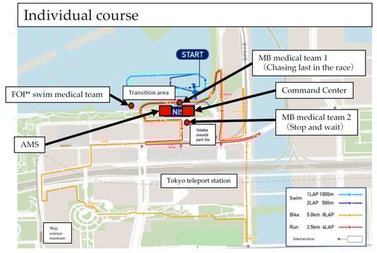 The triathlon for which we prepared the medical care planning and management was conducted at the Odaiba Kaihin Park (Odaiba Marine Park, OMP). Because the athletes completed three consecutive events, swimming, biking, and running, the standard medical setup to prepare for heatstroke and trauma in a stadium would not be sufficient. Special medical conditions during swimming could include drowning, swimming-related pulmonary edema, and hyponatremia, and 2% of swimmers are known to require some kind of medical treatment during competition [3]. Moreover, swimming, biking, and running were performed across a vast area, including part of an ocean, which required a correspondingly extensive medical setup to cover the area.