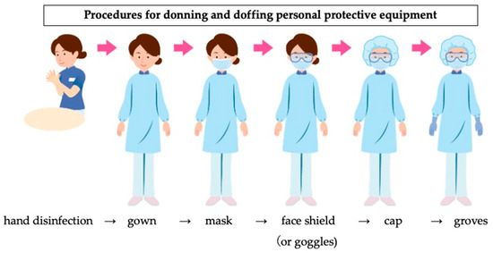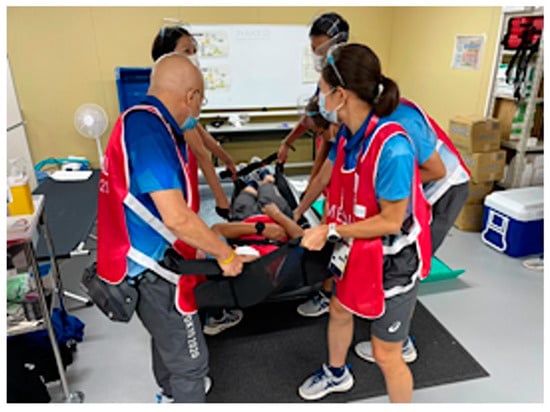 In response to the numerous athletes affected by heatstroke at the 2019 Tokyo Olympic Triathlon event, the race was started at an earlier time to lessen the athletes’ exposure to dangerous conditions. Ice baths, drinking water, and ice for cooling were prepared in greater quantities and were provided at more stations than usual. Staff needed to wear full personal protective equipment (PPE) to prevent infection in the extreme conditions (Figure 5), which consisted of a cap, face shield, mask, gloves, and gown. Therefore, we established shifts to help the staff take more frequent breaks than normal and instructed them to regularly drink water. Furthermore, we had the entire team use a special app to manage health status rather than basing it on self-report (LINE WORKS®); the app was used to share positive results with the entire group of medical staff, athletes, coaches, support staff and their close contacts. Finally, all athletes, coaches, tournament management staff, and medical staff took a COVID-19 PCR test each time they entered the venue from outside the bubble.