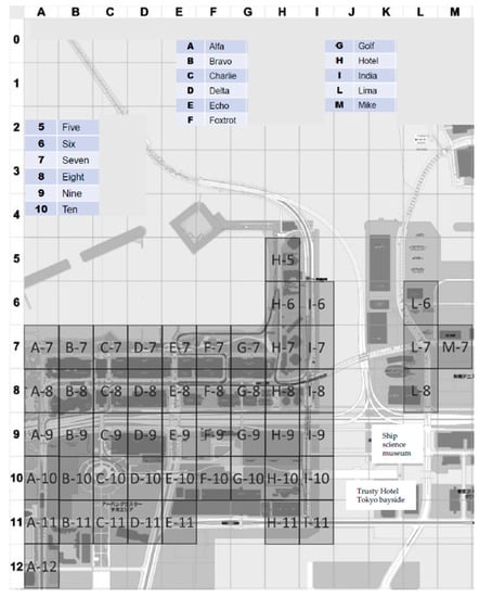 Grid map of the 2020 Olympic triathlon individual course. Accidents could be mapped on the grid and located according to their grid number, and this grid map was shared with all venue staff. A staff person who discovered an accident would report the grid number, and the medical commander would dispatch a motorbike team to the location.