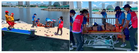 Furthermore, in triathlons, the reported risk of traumatic injury is 1.65-fold that of general sprinting events [13]. According to Harris et al., 122 deaths occurred in the 32 years between 1985 and 2016 in triathlon events held in the USA, and 90 of these occurred during the swim, of which 93% occurred in open water [14]. The event is performed across a vast area, and medical staff must be prepared to respond to multiple injuries and illnesses that can occur at the same time. Indeed, three athletes fell from bikes in a 7 min span in the individual women’s race, all of whom required medical attention for traumatic injuries. Furthermore, heatstroke is not the only internal medical condition specific to this event; water intoxication and hyponatremia are also possible conditions that require caution. In short, managing medical aid in a triathlon requires (1) thorough understanding of triathlon as a sport and (2) thorough knowledge in traumatology, emergency medicine, and disaster medicine.