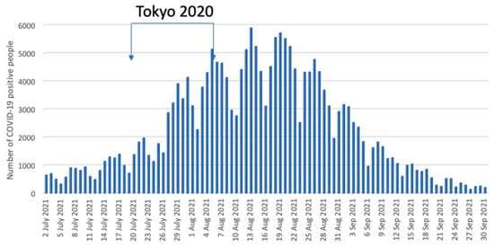 Number of COVID-19 positive people in Tokyo during the 2020 Tokyo Summer Olympics. The number began to increase before the opening of the Tokyo 2020 Games and reached the peak after it ended.