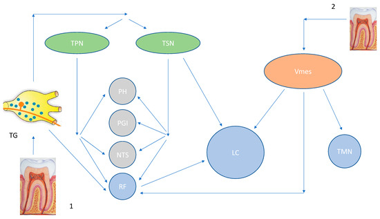 [131]: Trigeminal Pathways to Brainstem structures. Legenda: TG: Trigeminal Ganglion, TPN: Trigeminal Principal Nucleus, TSN: Trigeminal Spinal Nucleus, PH: Prepositus Hypoglossi, PGI: Nucleus Paragigantocellularis, NTS: Nuclues of Tractus Solitarius, RF: Reticular Formation, Vmes: Trigeminal Mesencephalic Nucleus, LC: Locus Coeruleus, TMN: Tuberomammillary Nucleus, 1: Somato-sensory and Periodontal Ligament/Pulpar afferents, 2: Proprioceptory Periodontal Ligament afferents.