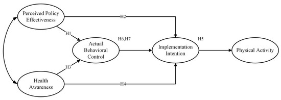 According to the TPB, exogenous factors indirectly influence intention through the personal situation perceptions of actual behavioral control [24]. Nguyen [37] argues that behavioral control determines implementation intention. The actual behavioral control is a product of the combined effects of several other exogenous variables, such as policy, awareness, and external elements. Compared with general intentions, implementation intentions have an obvious goal orientation for the actions to be performed and when, where, and how to carry out the intentions. For example, in the case of physical activity, the implementation intention can be stated as “I plan to run in the park next to my house from 6:00 AM to 7:00 AM before work every day”. Here, implementation intentions are associated with opportunities to act (to park next to home and time) with behavior (e.g., running, playing, dancing). Oteng–Peprah et al. [38] believe that people’s behavior will be driven by intention before it occurs. Whether an individual performs this behavior, the behavioral intention has an important impact on future behavior. For example, when individuals want to improve their physical condition, they will be more willing to inquire about relevant health advice to answer their doubts. In physical activity, actual behavioral control is the individual’s perception of how easy or difficult it is to perform a specific physical activity behavior. For example, after getting off work, you go to the next basketball court to play, which means that the resources needed by the individual to complete the goal of playing are relatively easy to obtain. Potthoff et al. [39] found that implementation intention interventions had a small to medium effect on objectively assessed health behavior. Therefore, this study thus proposes the following hypotheses: