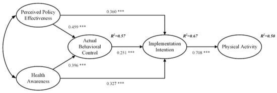 Since the standardized coefficients did not exceed 1, the error variance was positive, and no extremely large or small standard errors were generated, so the model did not generate violation estimates. In addition, the model fit index (χ2/df = 2.220, GFI = 0.918, NFI = 0.937, CFI = 0.964, TLI = 0.958, and RMSEA = 0.057) conformed to the standard, indicating that the overall fit of the model was good [51]. Table 3 shows a significant positive correlation among the independent, mediating, and dependent variables, which provided preliminary support for validating the hypotheses. The structural path model is shown in Figure 2; the effect of perceived policy effectiveness on actual behavioral control was statistically significant (β = 0.459, p < 0.001), supporting H1; the effect of perceived policy effectiveness on implementation intention was statistically significant (β = 0.360, p < 0.001), supporting H2; the effect of health awareness on actual behavioral control was statistically significant (β = 0.396, p < 0.001), supporting H3; the effect of health awareness on implementation intention was statistically significant (β = −0.327, p < 0.001), and supporting H4.