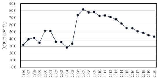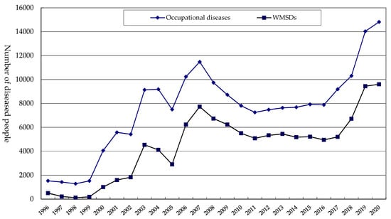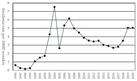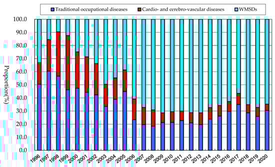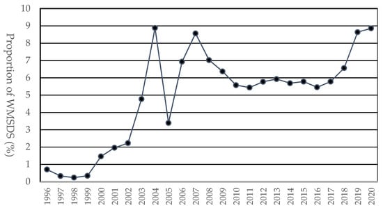 Data of WMSD cases were obtained from official yearbooks for industrial accidents published by the Ministry of Employment and Labor []. These yearbooks were used as data source for WMSDs because only the books provide official statistics for industrial accidents including WMSDs in Korea. The data include the number of industrial accidents and occupational diseases, including WMSDs, cardio- and cerebrovascular diseases, etc., classified by various factors, such as industry type and size, workers’ gender and age, working period, managerial and direct causes, injury type, injured body part, etc. For investigating various trends of WMSDs, the incidence rates of WMSDs per 10,000 workers, proportions of WMSDs among industrial accidents, rates of low back pain among WMSDs, and distribution of traditional occupational diseases, cardio- and cerebrovascular diseases, and WMSDs among total occupational diseases were calculated based on the data of the yearbooks in this study. Here, WMSDs are classified by industry type and size, and workers’ gender and age. For surveying the overall trends of WMSDs by year, the data on WMSDs from 1996 to 2020 were analyzed in this study, because the data have been collected and published annually by the Ministry of Employment and Labor since 1996, and the data for 2021 have not been published yet.