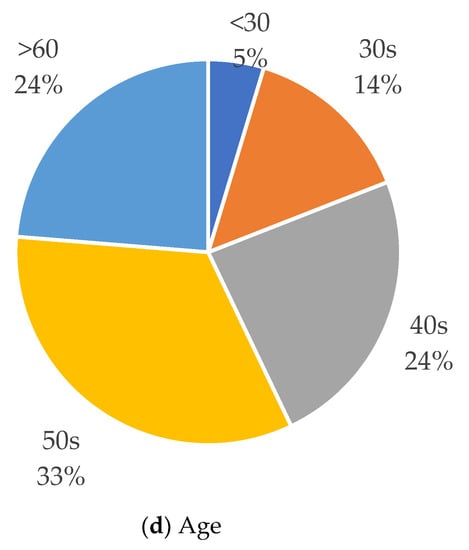 For establishing efficient preventive measures or policies for WMSDs, studies dealing with WMSD characteristics based on real WMSD case data, such as effects of workers’ age, industry type and size, MSD name, etc., are needed. However, most previous studies focused on the prevalence of WMSDs based on subjective questionnaire surveys, the liabilities of which may not be high [,,,,,]. For example, Iglesias et al. [] reported a significant prevalence of musculoskeletal complaints in daily podiatry work. Rahimi et al. [] pointed out that the prevalence of WMSDs was 94% in Iranian physiotherapists. Both studies were based on the Standardized Nordic Questionnaire. Some researchers studied the prevalence of WMSDs among the workers in motor companies, ship building, subway train repair, disabled infant and children care center workers, dentists, nurses, and agricultural workers in Korea, all of which were based on subjective questionnaires [,,,,,,,]. The Rural Development Agency (RDA), an affiliation of the Ministry of Agriculture, Food and Rural Affairs of Korea, investigated diseases of agricultural, forestry, and fishing workers aged 19 or more in 10,020 households in 2020, which was based on a direct interview survey using a structured questionnaire. WMSD was identified as the most prevalent disease (84.6%), followed by circulatory system diseases (3.0%), skin diseases (2.9%), and nervous system diseases (2.1%) [].