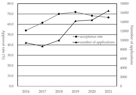 As stated above, COMWEL determines whether or not MSDs of applicants were attributed to work-related factors (i.e., MSDs approved (WMSDs) vs. MSDs rejected (MSDs not approved as WMSDs)). The number of applications for the six years (2016–2021) ranged from 8715 to 16,441 with a steady increase except in 2017 (Figure 7). The approval rate that the applicants’ MSDs were accepted as WMSDs rose by approximately 18%, from 54.0% in 2016 to 71.9% in 2019, and since then, it has slightly decreased to 66.6% in 2021.