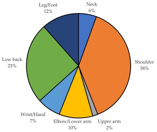 WMSDs constitute one-third of work injuries and illnesses. They have significant economic and social consequences, including rising costs of wage compensation and medical expenses, reduced productivity, and lower quality of life [,,]. WMSDs cost 40% of global compensations for occupational and work-related injuries and diseases, and in 2005, they took up 59% of all recognized occupational diseases across the European Union [].