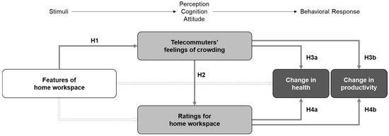 As previously mentioned, there is ample evidence that crowding feelings in the workplace affect workers’ perceptions and behaviors [44,58,59,60,61]. Our second and third hypotheses were determined to examine these relationships in the WFH context. The second hypothesis investigates the impact of telecommuters’ crowding feelings on their ratings for home workspace (H2), and the third hypothesis assumes the influence of crowding feelings on changes in health (H3a) and productivity (H3b) before and during COVID-19.
