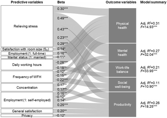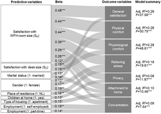 We conducted multiple linear regression analysis using a stepwise method, with each home workspace rating as an outcome variable. Figure 2 shows the seven regression models schematized as the Sankey diagram. To create a Sankey plot showing a regression model, we referred to the study of Neff et al. [88]. Appendix A includes a table of regression models. In Figure 2, predictive variables are presented on the left, and the width of the ribbon coming from each predictor represents the size of the standardized coefficients (beta), regardless of their polarity. Seven outcome variables are shown on the right, with a summary of each model.