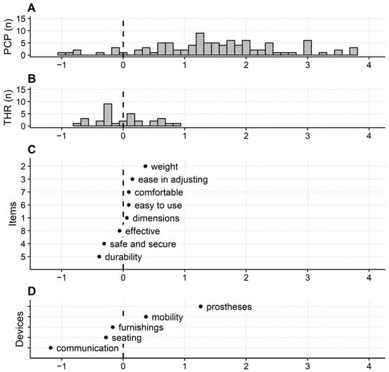 Figure 1. Questionnaire map of the QUEST 2.0–device. (A): distribution frequency of the patients’ measures. (B): distribution frequency of the items’ thresholds calibrations (Andrich thresholds). (C): items’ calibrations. (D): devices’ calibrations. Participants, items (with the Andrich thresholds), and devices are the first, second, and third facets of the Many-Facet Rating Scale model used for the Rasch analysis. PCP: participants; THR: thresholds; n: number of. Items’ content is abbreviated with a keyword, and the ordinate gives the item number in the questionnaire. Devices are abbreviated as in Table 1. Items and devices are ordered low to high, from the easiest to the most difficult to endorse. Extreme participants are not shown.
