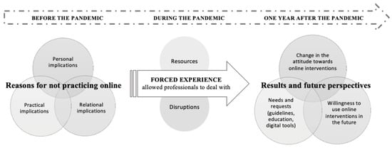 The results of the present study show that the experience of online interventions forced by the circumstances of the COVID-19 pandemic allowed Italian psychologists and psychotherapists to use and experiment with online treatment in their clinical practice, resulting in a lasting change in their attitudes toward and intent to use such tools and, thereby, charting new perspectives for the future of clinical practice. This extensive experience brought professionals challenges and disruptions but also resources and possibilities connected to the use of online interventions and revealed specific issues, such as those regarding the relational aspects and implications of the virtual setting.