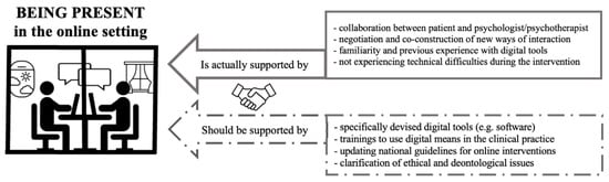 Effective therapeutic relationships in online sessions requires both professionals and patients to explore and negotiate new ways of interaction. Though these ways may be similar to those employed in an in-person session, the online setting also necessitates the collaborative construction of a dialogue and cooperation between the two parties to define opportunities as well as boundaries [18,36]. In line with this concept, our results pointed to possible future directions for interventions and further investigations, as participants underlined the importance of a multi-level collaboration among multiple parties (such as colleagues, institutions, and patients) to address the challenges and uncertainties faced by professionals who prioritize feeling present in the satisfying therapeutic relationships of their online practice (see Figure 3).