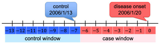A case-crossover study design was used to evaluate acute triggers from environmental factors potentially causing disease. In the case-crossover study design, each case serves as his/her own control; that is, the study is self-matched and helpful in evaluating the effects of short-term changes in exposure on transient changes in disease risk. For each patient, we defined the “case window”, the period during which the person was a case, as the week of onset; that is, the week that began six days before the onset of the disease and ended on the day of disease onset. The “control window”, the period during which the person was not a case, was defined as the seven days before the week of onset; that is, the week that lasted from 13 days to seven days before the onset of the disease. The illustration figure is shown in Figure 1. For example, a patient was a case on day 0, and his/her self-matched control was on day −7. A patient with environmental exposure three days before the onset of the disease means that he/she was a case and exposed to environmental factors on day −3, and his/her self-matched control and related exposure in the control period was on day −10.