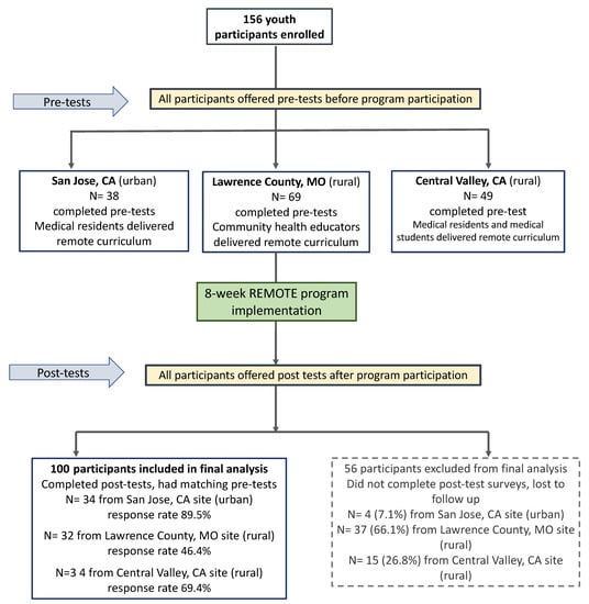 A total of 156 high school student participants were recruited and completed pre-surveys before starting the program at the three sites. Of these 156, 100 participants had matching and complete post-surveys and were included in the final analysis. Of the 100 participants in the final sample, 34 were from San Jose, CA (response rate 90%), 34 from Central Valley, CA (response rate 69%), and 32 from Lawrence County, MO (response rate 46%) (Figure 1). 84% were female, 70% were 11th and 12th grade students, mean age was 16 years and 40% were Hispanic or Latino (Table 2).