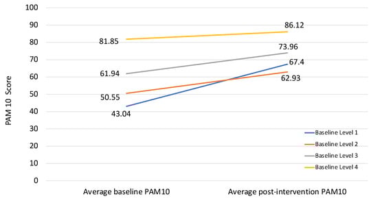 As seen in Table S2 in Supplementary Materials, 100% of participants who started at Level 1 increased their activation level; 67% participants who started at Level 2 increased their activation level; 43% who started at Level 3 increased their activation level, and 77% participants who started at Level 4 maintained this highest level of activation after program participation.