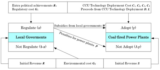 China has a huge potential market for CCUS applications. The total primary energy production is estimated to reach 4.3 billion tons of standard coal in 2030, and the carbon dioxide emissions will reach a peak of 11.2 billion tons. In terms of storage and application, taking EOR as an example, approximately 13 billion tons of crude oil geological reserves in China are suitable for EOR, which can improve crude oil recovery by 15%, increase production reserves by 1.92 billion tons, and store about 4.7–5.5 billion tons of carbon dioxide [30]. The applications of CCUS technology mainly include physical, chemical engineering, and biological applications. The physical applications mainly include, among others, beer and carbonated beverages; oil displacement agents for tertiary recovery of petroleum; inert gas shielded welding in welding process; cold energy of liquid and solid CO2 for refrigeration, storage, and transportation of food and vegetables; natural oxygen reduction in fruits and vegetables; modified atmosphere preservative; and supercritical CO2 extraction. The chemical applications mainly include inorganic and organic fine chemicals, polymer materials, etc. For example, CO2 can be used as a raw material to synthesize urea and produce light, nano-grade, ultra-fine active carbonate; CO2 is catalytically hydrogenated to produce methanol; CO2 is used as a raw material to synthesize a series of organic raw materials; CO2 and epoxide are copolymerized to produce high polymers; and a series of hydroxylated carbon chemicals was developed by converting CO2 into CO. The biological applications mainly include the use of microalgae to fix CO2 and convert it into biofuels and chemicals. After the initial demonstration stage, the cost of biofertilizers, food, and feed additives is expected to decrease by 10–20% when the production capacity of CCUS is doubled [31,32,33,34,35]. Nie [36] established an evolutionary game model to analyze the interaction process and evolution direction between local governments and coal-fired power plants. The findings showed that when the unit price of hydrogen drops to 15.9 RMB/kg or the unit price of carbon dioxide derivatives rises to 3.4 RMB/kg, the evolution stability strategy of the system changes, and the power plant turns to CCU technology (Figure 5).