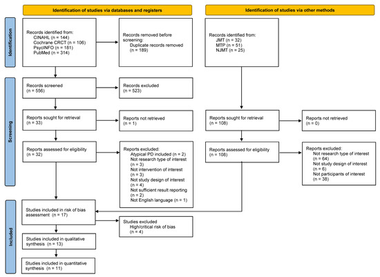 Initially, 745 articles were retrieved from the databases CINAHL, PsycINFO, PubMed, and Cochrane Library CENTRAL. One hundred eighty-nine articles were removed after screening out duplicate records. From the remaining 556 articles, 523 were excluded based on their titles and abstracts. Then, one additional duplicate study in a different title was removed. Thirty-two articles were assessed for their eligibility and 17 of those studies remained. After conducting a risk-of-bias assessment, four studies with a high and critical risk of bias were excluded. Ultimately, a total of 13 articles met the inclusion criteria for a systematic review, leaving 11 articles for the meta-analysis. At this stage, two studies were excluded due to insufficient data for meta-analysis. In addition, 108 articles were selected from the Journal of Music Therapy, Music Therapy Perspectives, and the Nordic Journal of Music therapy, but none of those articles satisfied the eligibility criteria of this study. The detailed flow diagram of the literature search, screening, and selection is shown in Figure 1.