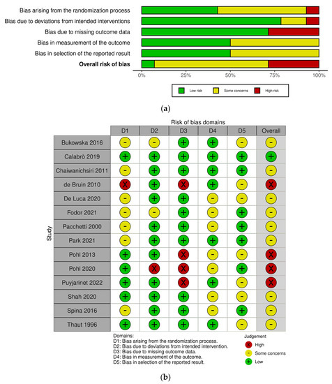 Risk-of-bias graphs for the randomized controlled trial (RCT) studies. (a) Risk of bias as a percentage and (b) risk-of-bias summary [16,19,26,27,30,36,38,39,54,55,56,57,58,59].