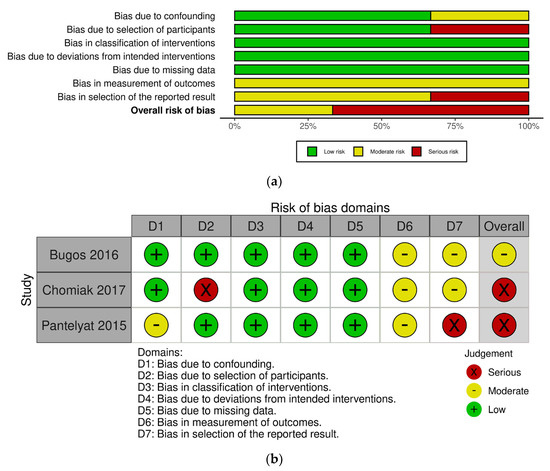 Risk-of-bias graphs for the controlled clinical trial (CCT) studies. (a) Risk of bias as a percentage and (b) risk-of-bias summary [28,29,37].