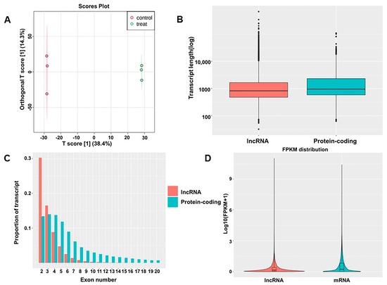 Identification of lncRNAs and comparison with mRNAs. (A) OPLS−DA of lncRNAs; (B) lengths of lncRNAs and mRNAs; (C) exon numbers of lncRNAs and mRNAs; (D) expression levels of mRNAs and lncRNAs.
