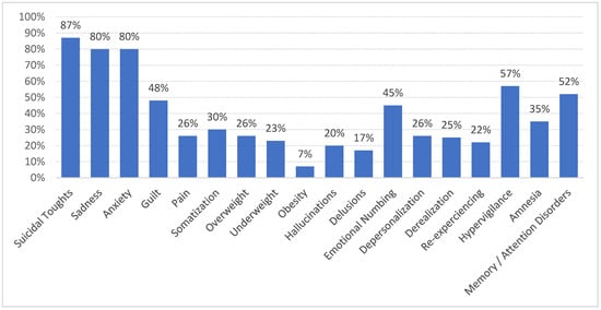 The descriptive clinical data report a symptomatic polymorphism (Figure 1 and Figure 2), mixing mood disorders, behavioral disorders (including eating disorders), dissociative symptoms, symptoms of post-traumatic stress disorder, and somatizations. Literature data have reported that the consequences associated with SA are very diverse and do not allow for the establishment of a clinical profile []. There is evidence that CSA is now considered as a general, nonspecific risk factor for psychopathology (including psychologically, behaviorally, and sexually related problems and later revictimization as well as somatizations) []. However, a link is particularly well established between a history of SA and the occurrence of self-harm, NSSI, and suicidal behaviors [,,], which could support the very high proportion of these behaviors in our cohort (two-third of patients). It is now considered that CSA makes both direct and indirect contributions to suicidal behavior. Psychopathologies, such as post-traumatic stress disorders, personality disorders (including impulsivity), and mood disorders may mediate the relationship between CSA and suicidal behavior. It is a complex process involving psychopathology, maladaptive personality features, and the direct contribution of CSA itself [].