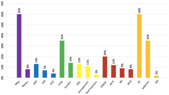 Breakdown of diagnoses. MDD: Major Depressive Disorder; Bipolar: Bipolar Disorder; GAD: General Anxiety Disorder; SAD: Social Anxiety Disorder; OCD: Obsessive-Compulsive Disorder; PTSD: Post-Traumatic Stress Disorder; Somatic: Somatic Symptom and Related Disorders; ASD: Autism Spectrum Disorder; Brief Psychosis: Brief Psychotic Disorder; EDNOS: Eating Disorder Not Other Specified; AN-R: Anorexia Nervosa Restrictive Type; BN: Bulimia Nervosa; AN-B: Anorexia Nervosa-Binge-Eating/purging Type; PD: Personality Disorders; Addiction: Addictive Disorders; IDD: Intellectual Developmental Disorder.