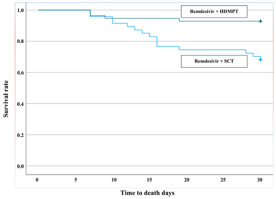 A total of 31.9% (15/47) of the patients who received remdesivir plus SCT died 30 days after admission compared with 7.3% (4/55) of the patients who received remdesivir plus HDCPT. Chi-square values (X2 = 10.15, sig: p < 0.001) and the Kaplan–Meier curve (log-rank: 9.99, p = 0.002) showed a significant difference in mortality at 30 days in the two groups of patients, with higher survival in patients treated with remdesivir plus HDCPT (Figure 1).