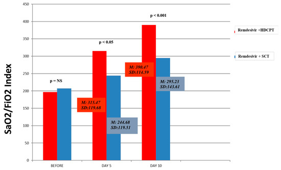 Statistical analyses were conducted using the Statistical Package SPSS version 27.0 (IBM Corp., Armonk, NY, USA). Means, standard deviation, and t-test analyses were calculated to assess homogeneity for age, sex, number of comorbidities, and basal SaO2/FiO2 (SaO2/FiO20) between the group of patients with remdesivir plus SCT and the group of patients with remdesivir plus HDCPT and the presence of significant differences in SaO2/FiO25 and SaO2/FiO210 after treatment. The Chi-square test measured differences in frequencies and percentages for death, admission to the intensive care unit with the need for IMV, and the need for NIV in the two groups of patients. To better analyze the impact of the two types of treatment on primary outcomes (death, admission to the ICU, need for NIV, SaO2/FiO25, SaO2/FiO210), with a control for age and the number of comorbidities, several multiple regression analyses were performed.