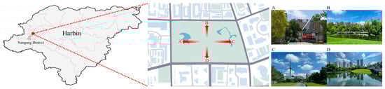 Residential land can carry a more complete population hierarchy [24]. Therefore, this study chose an urban park with mainly residential land use as the study site. Xiangjiang Park in Harbin City was selected as the study site, which is located in the Nangang District of Harbin City and has a large number of trees in the park, and a sightseeing water system. The park site is surrounded by a variety of building properties such as residential communities, shopping malls, hotels, tourist attractions, office buildings, etc. Taking it as the research object of the acoustic environment study is closer to the daily life and activities of nearby residents than large municipal parks far from the city, and it is representative of studying the psychological and physiological mechanisms of pressure relief of urban residents in the park acoustic environment. The park location and surrounding environment are shown in Figure 1.