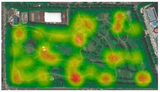 During the survey, visitors who stayed in each activity area of the park for more than 5 min were recorded and counted. The analysis was performed with Arc GIS Pro 2.8 to obtain the more popular rest–activity locations in the park, and their activity distribution is shown in Figure 3.