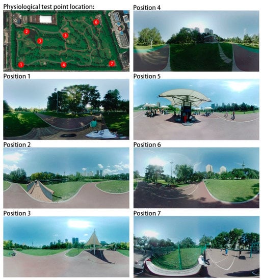 The buildings around this park are mainly residential houses, cultural and educational institutions, and administrative offices, which belong to the Class 1 sound environment functional area according to the sound environment quality standard GB3096-2008, with a daytime ambient noise limit value of 55 dB (A). According to the actual situation, a total of seven representative pilot sites were selected for the study, combined with the distribution map of residents’ activities and the sound environment distribution map. The environment of each test site is shown in Figure 5.