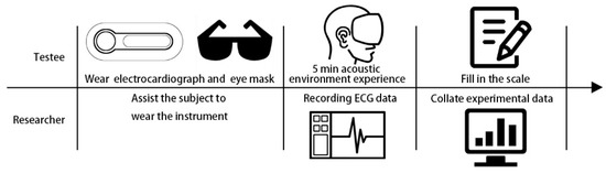 A total of 22 subjects screened by the PSS-14 scale were recruited for this study, with a male to female ratio of 1.2:1 and a mean age of 24 years. The participants were asked to avoid coffee, alcohol, and strenuous exercise 24 h before the test, refrain from smoking and get at least 8 h of sleep 8 h before the test. The subjects were accompanied by a recording officer at each experimental site and were assisted by the recording officer to put on the ECG equipment and the blindfold, which was used to reduce errors in physiological response due to visual factors. After this, the experiment began and the subjects were asked to listen to the type and variation of sound types at the experimental sites for 5 min at each site and record the ECG data of the subjects. The process of filling in the sound factor type questionnaire in the interval after the end of each measurement is one experimental unit, and the above steps are repeated for the next park sample experiment. The flow of the experimental unit is shown in Figure 6.