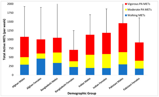 In contrast to the MVPA findings, Afghan youth reported spending the highest amount of time walking on average, with Indian participants spending the lowest amount of time walking (see Table 1). However, when accounting for the total energy expended (in METs) in all forms of activity (walking, moderate-intensity, and vigorous PA), the results were very similar to the above-reported findings of total time in MVPA. As outlined in Table 1 and illustrated in Figure 2, Pakistani males expended the highest weekly METs and Bangladeshi females expended the lowest active METs per week.